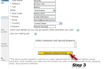 Step 3. Provide your contact and shipping information in the following page and submit your request for pricing by clicking on the "Request Volume Pricing" button. The submitted quote request is sent to our sales department for verification before actual purchase. Once verified, our sales rep will contact you with a total discounted price, shipping costs, and payment methods.