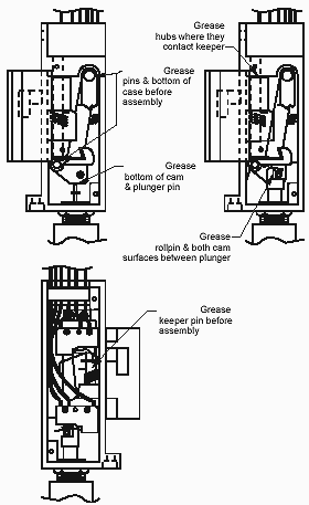 7. Lubricate the area in the case where the locking lever and locking cam rests Note: Be careful not to get lubricant on the solenoid or switches.  Lubricate the cam pin and lever pin.